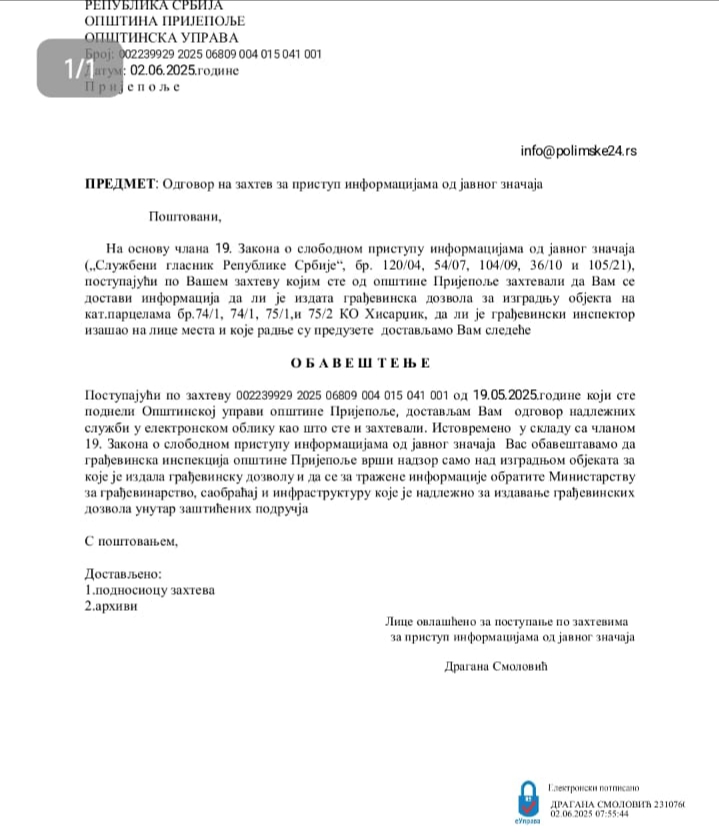 Подсећамо: пре обраћања Министарству, Полимске24 је исто питање упутило Општинској управи Пријепоља. Одговор је био изричит — нисмо надлежни.