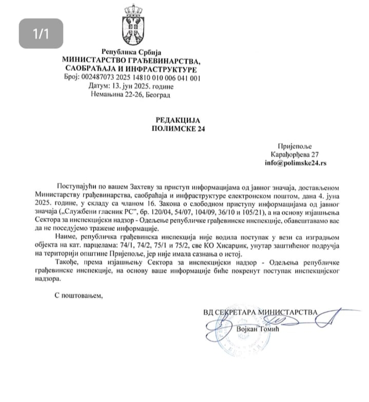 Редакција Полимске24 је 4. јуна 2025. године поднела званичан захтев Министарству грађевинарства, саобраћаја и инфраструктуре за доступност јавних информација у вези са изградњом нелегалног објекта у заштићеном подручју кањона реке Милешевке, у власништву Есада Хоџића, саветника министра Хусеина Мемића.